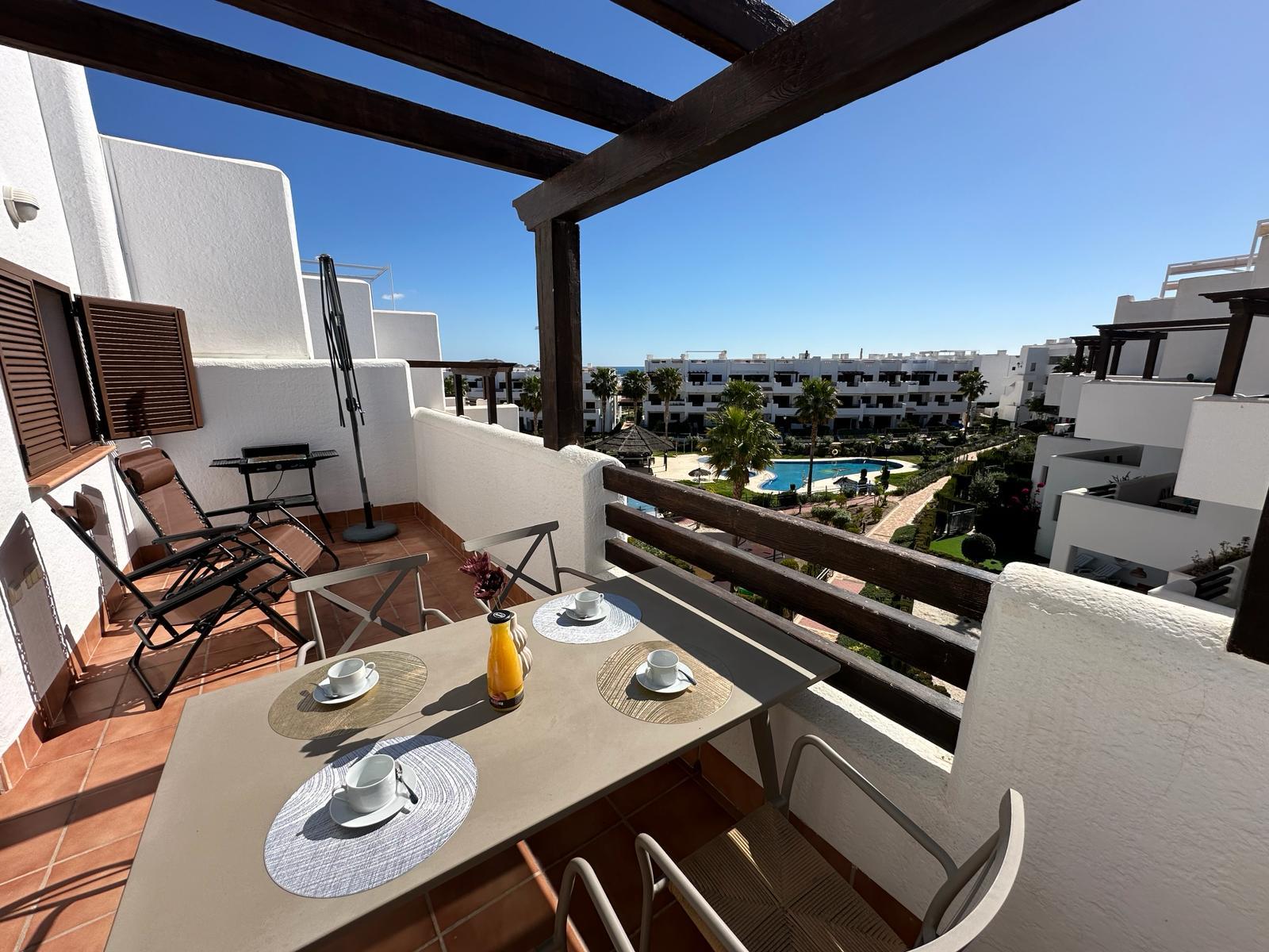 Encantador y confortable apartamento en San Juan de los Terreros, Andalucía, España, con piscina comunitaria para 4 personas. El apartamento está situado en un complejo vacacional en una zona residencial y montañosa de playa, cerca de restaurantes, bares, supermercados y una pista de tenis, y se encuentra a 500 m de la playa de los Nardos.