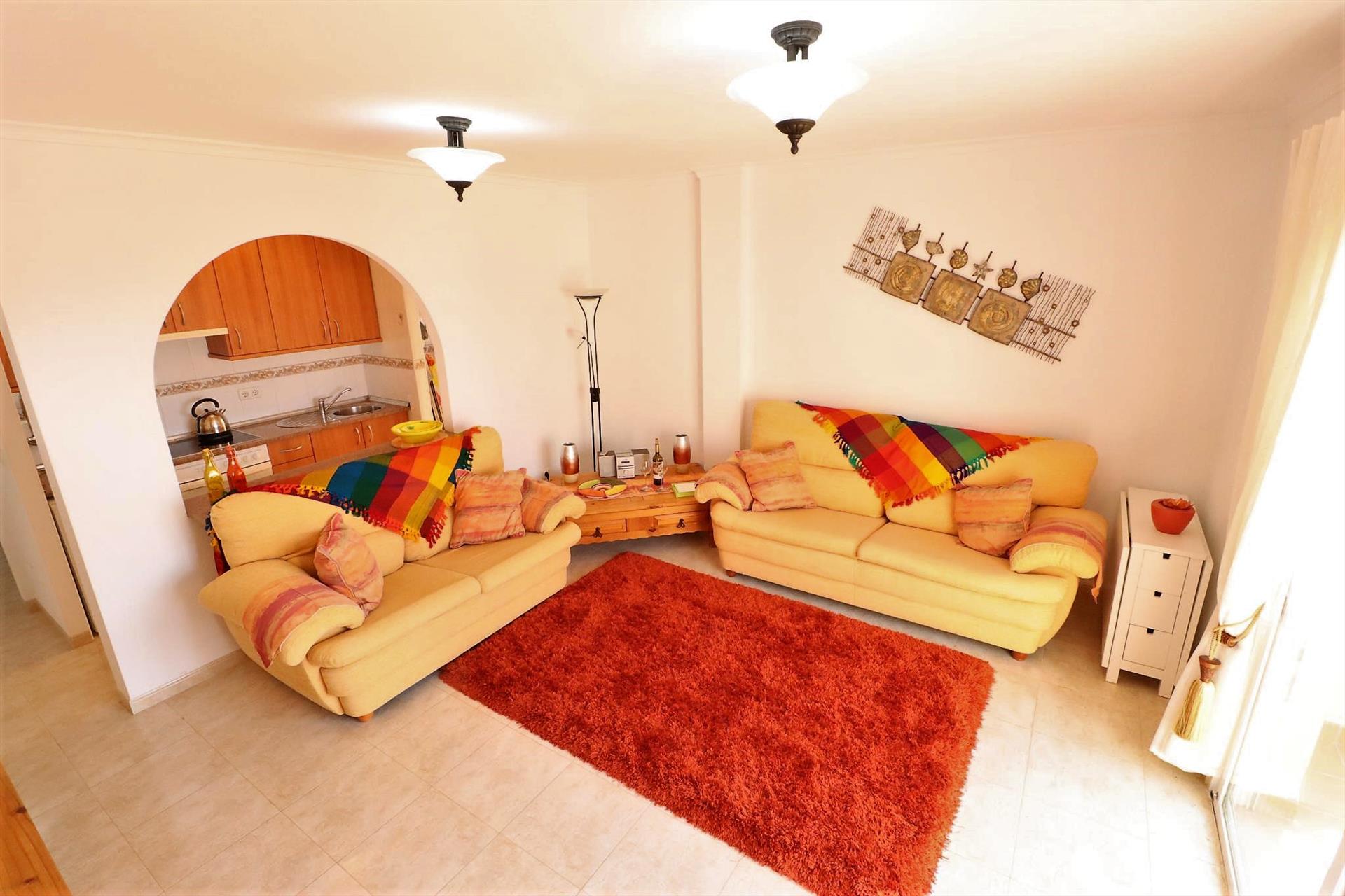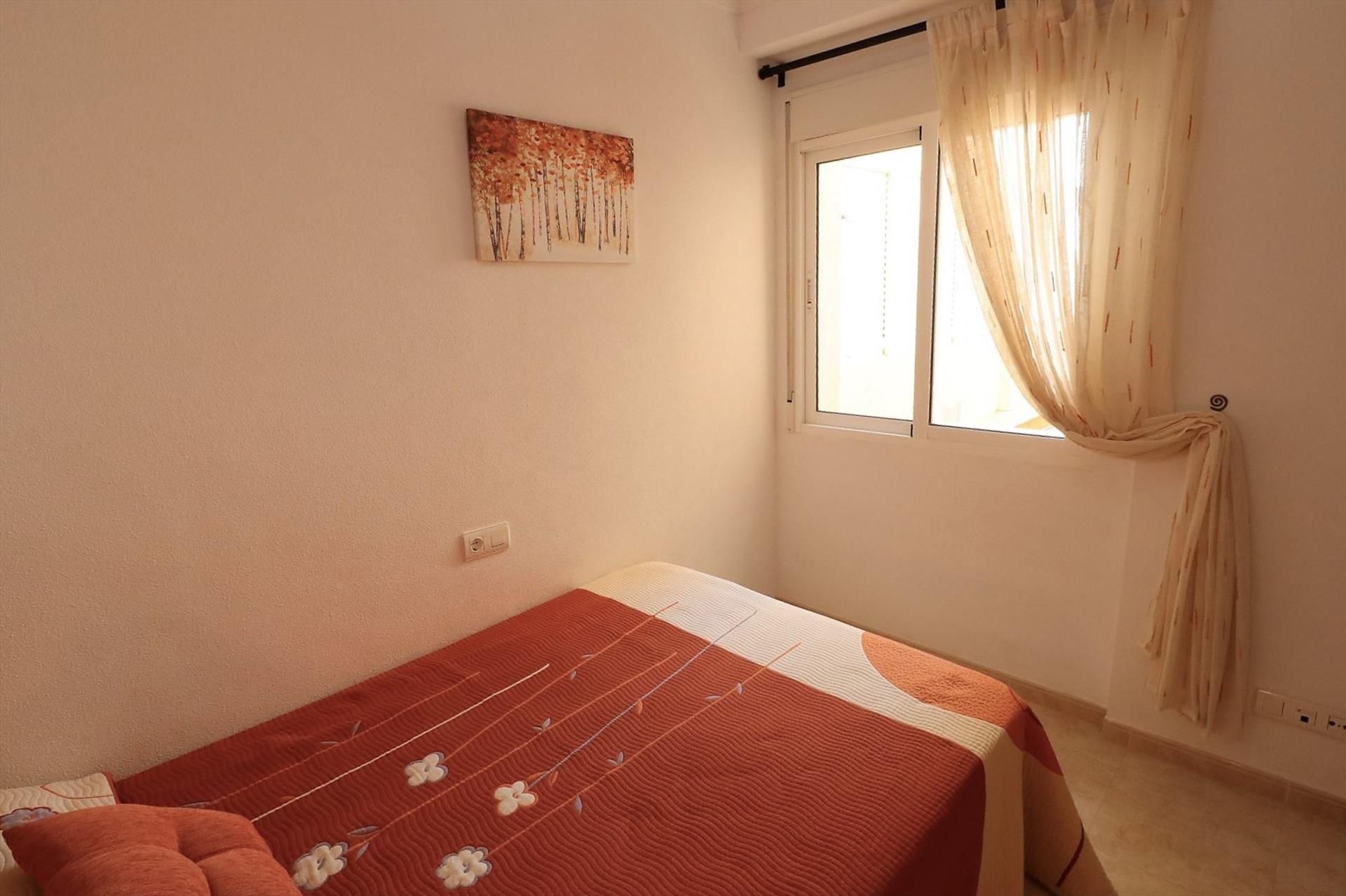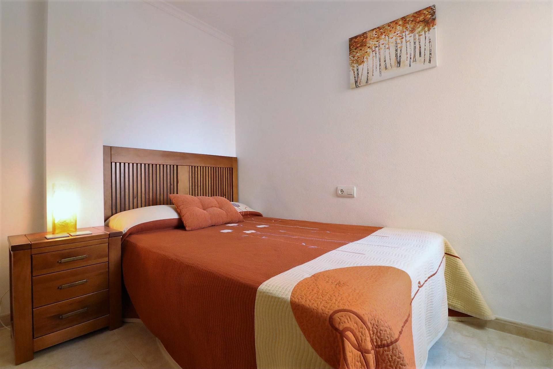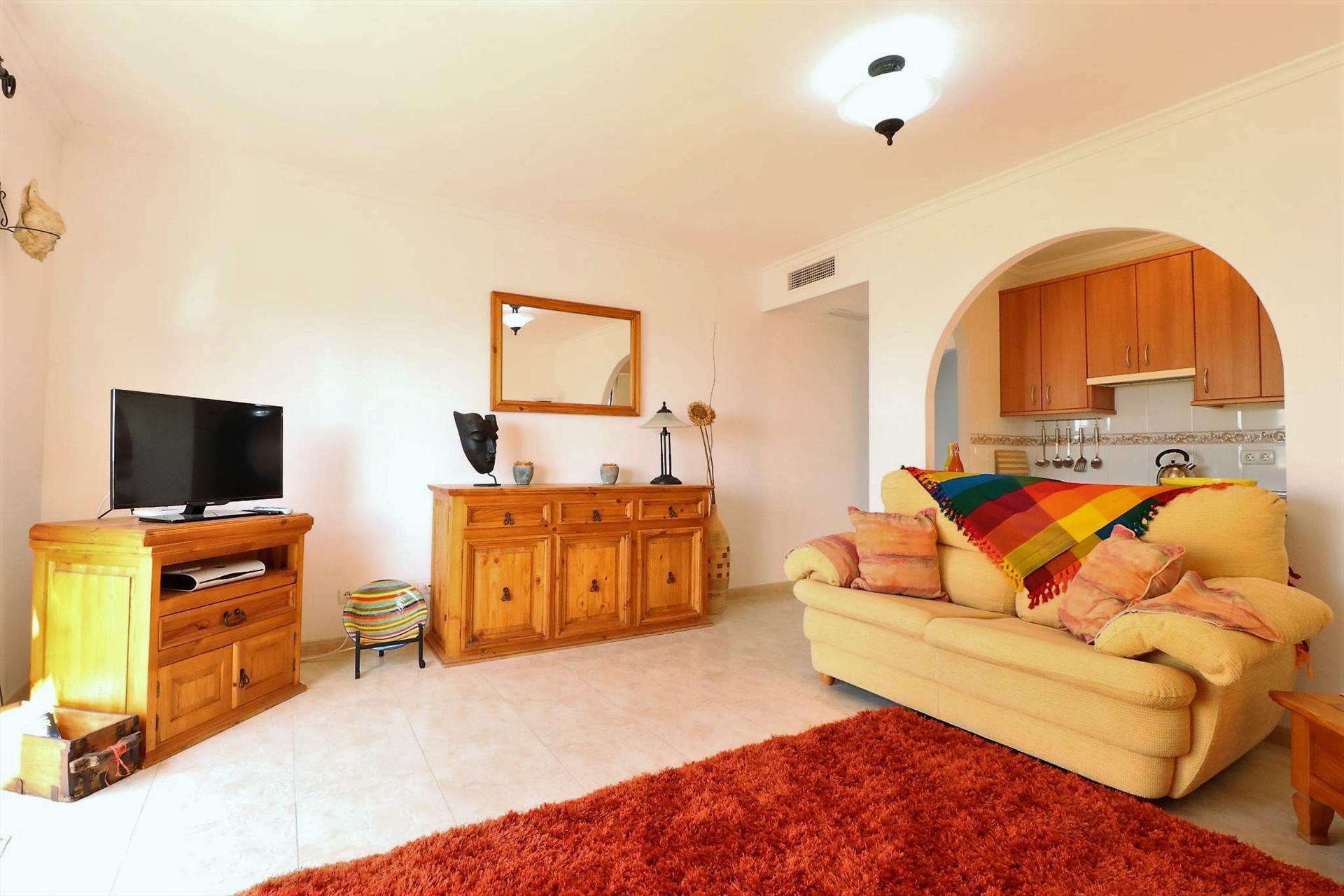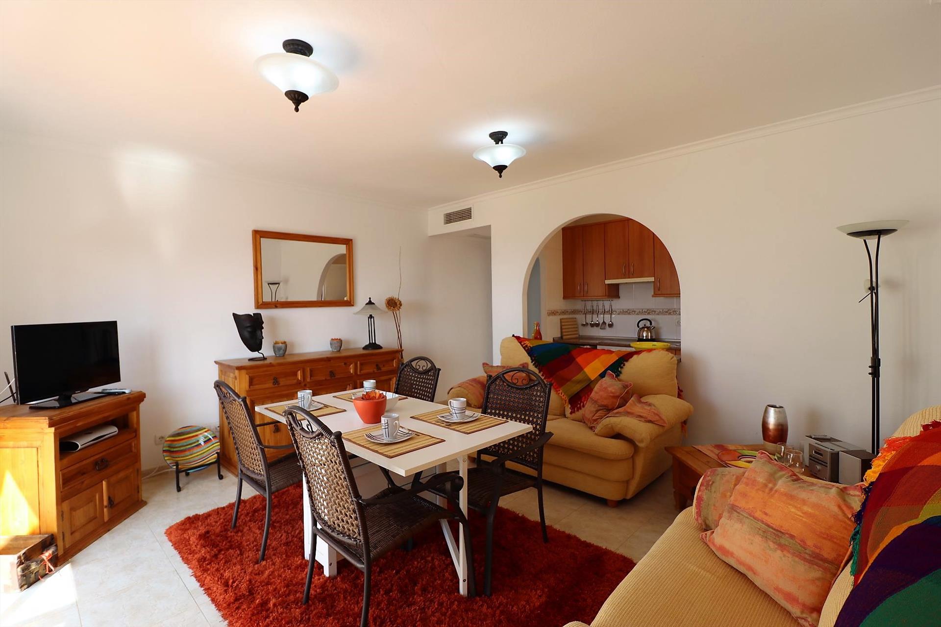 El apartamento cuenta con 2 dormitorios y 1 baño. El alojamiento ofrece un jardín comunitario con césped y árboles, maravillosas vistas del jardín, y hermosas vistas del mar, las montañas, la ciudad y la piscina. La cercanía a la playa, lugares para ir de compras, actividades deportivas, vida nocturna, lugares de interés y cultura hacen de este un excelente apartamento para pasar sus vacaciones en España con familia o amigos.