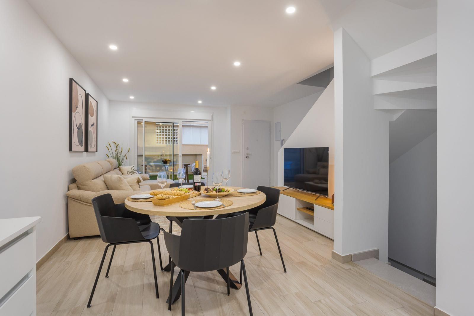 La casa cuenta con 3 dormitorios y 2 baños, distribuidos en 3 niveles. El alojamiento ofrece un jardín con grava. Su confort y la proximidad a la playa, zonas comerciales, actividades deportivas y lugares de ocio hacen de esta una excelente opción para pasar sus vacaciones en España con familiares o amigos.