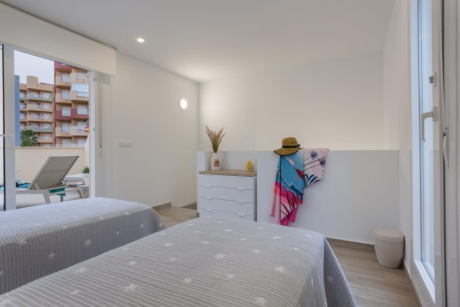 Maravillosa y cómoda casa en La Manga, Costa Cálida, España, con piscina comunitaria para 6 personas. La casa está situada en una zona residencial de playa, cerca de restaurantes, bares, tiendas y supermercados, a solo 100 m de la playa.