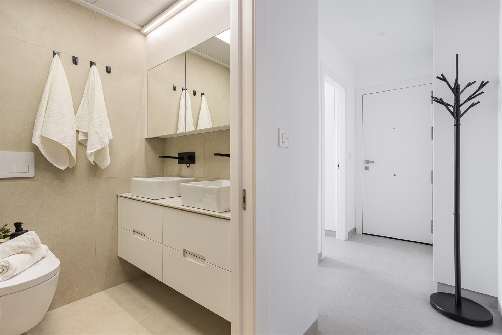 • baño con lavabo doble, ducha, inodoro y secador de pelo