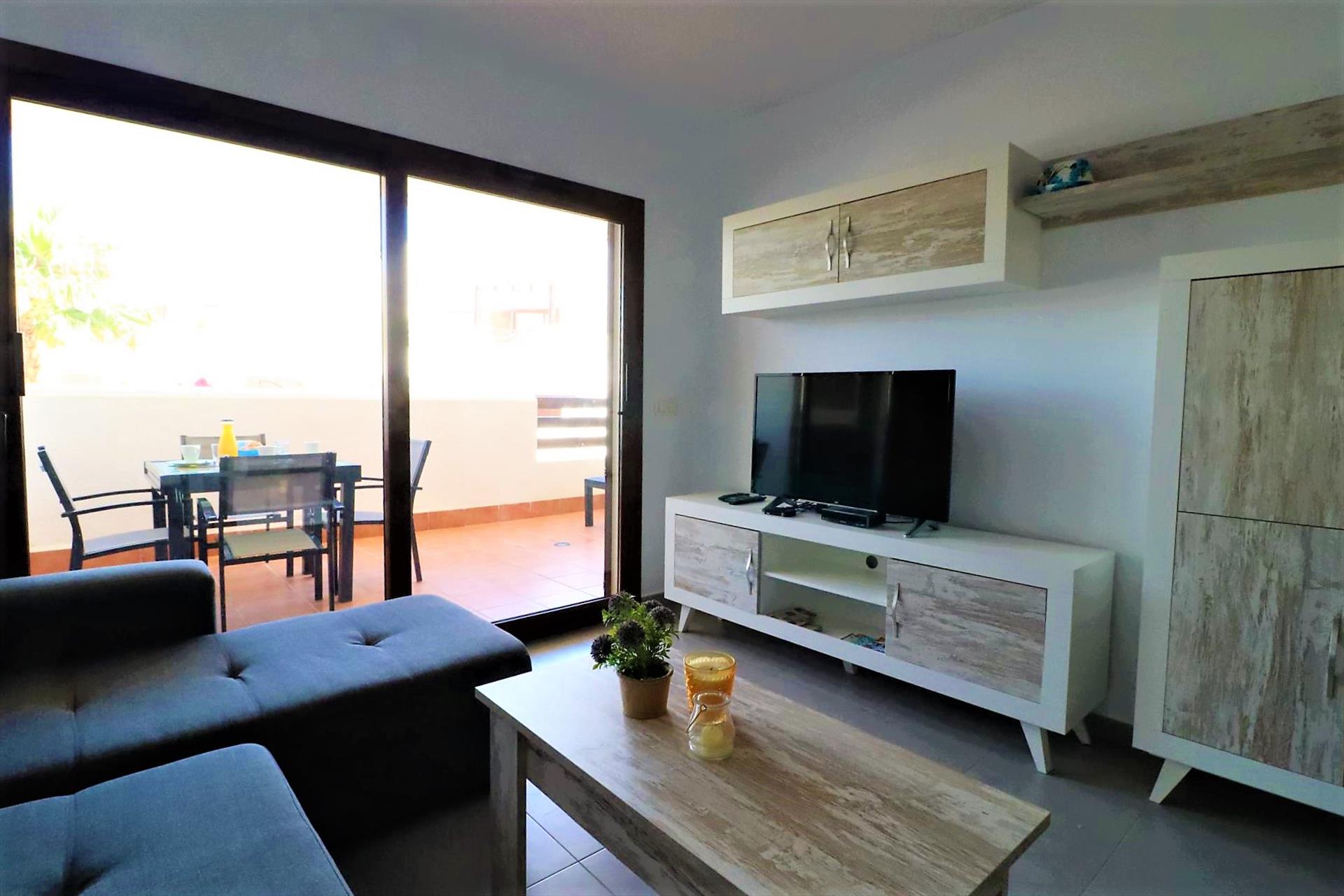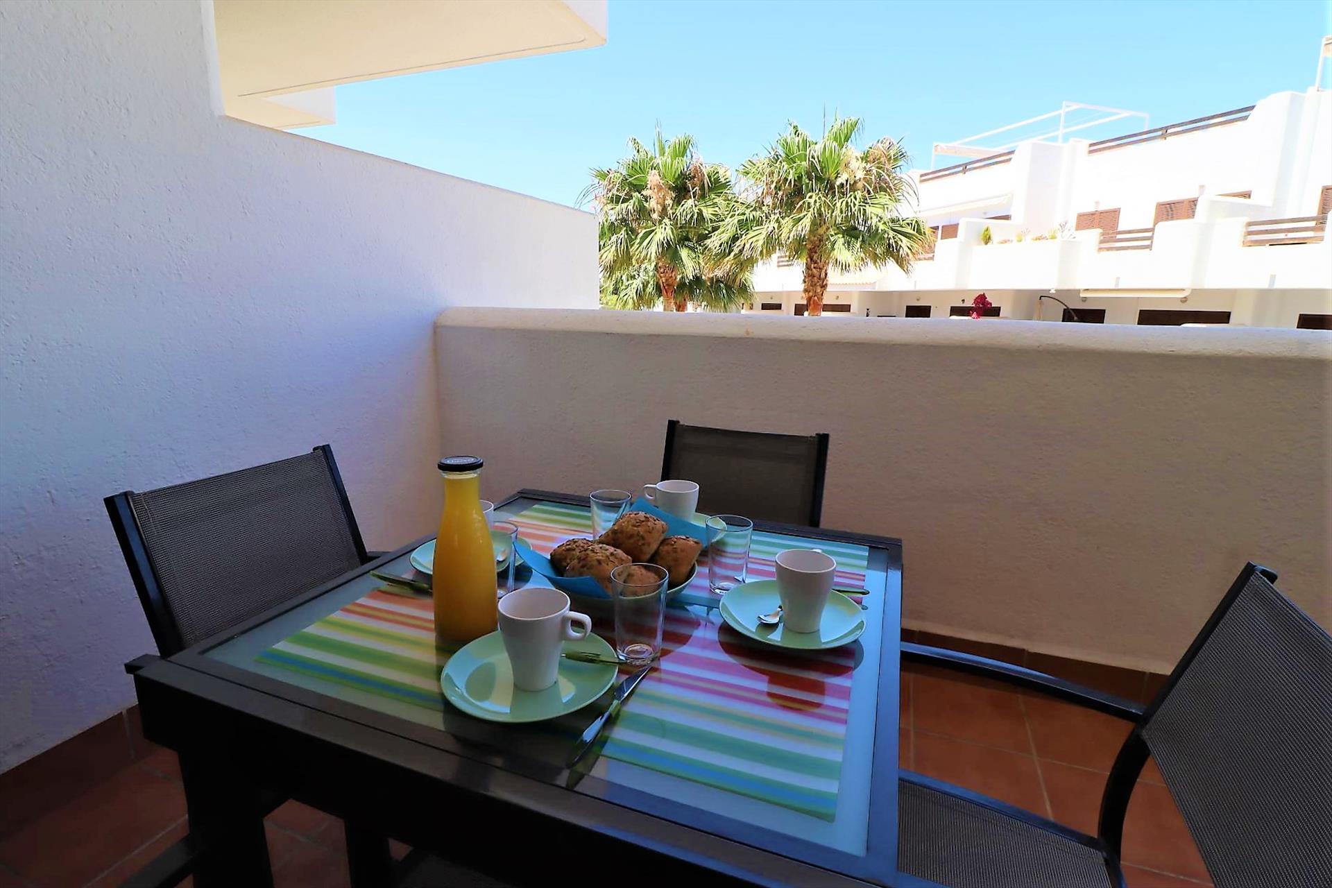 Agradable y luminoso apartamento con piscina comunitaria en San Juan de los Terreros, Andalucía, España para 6 personas. El apartamento está situado en un complejo turístico, en una zona residencial y montañosa junto a la playa, cerca de restaurantes y bares, supermercados y una pista de tenis, y se encuentra a 500 m de la Playa de Nardos.