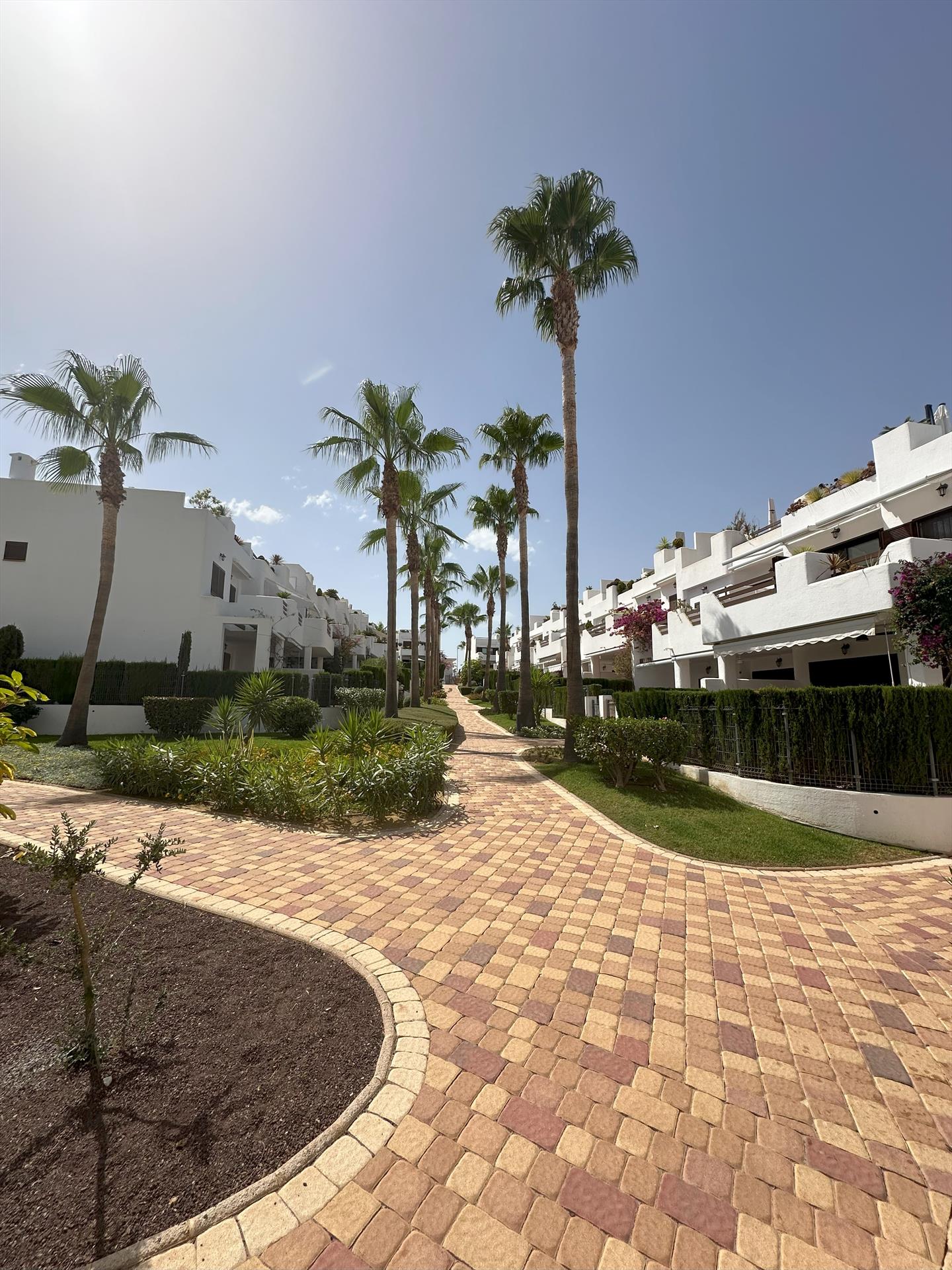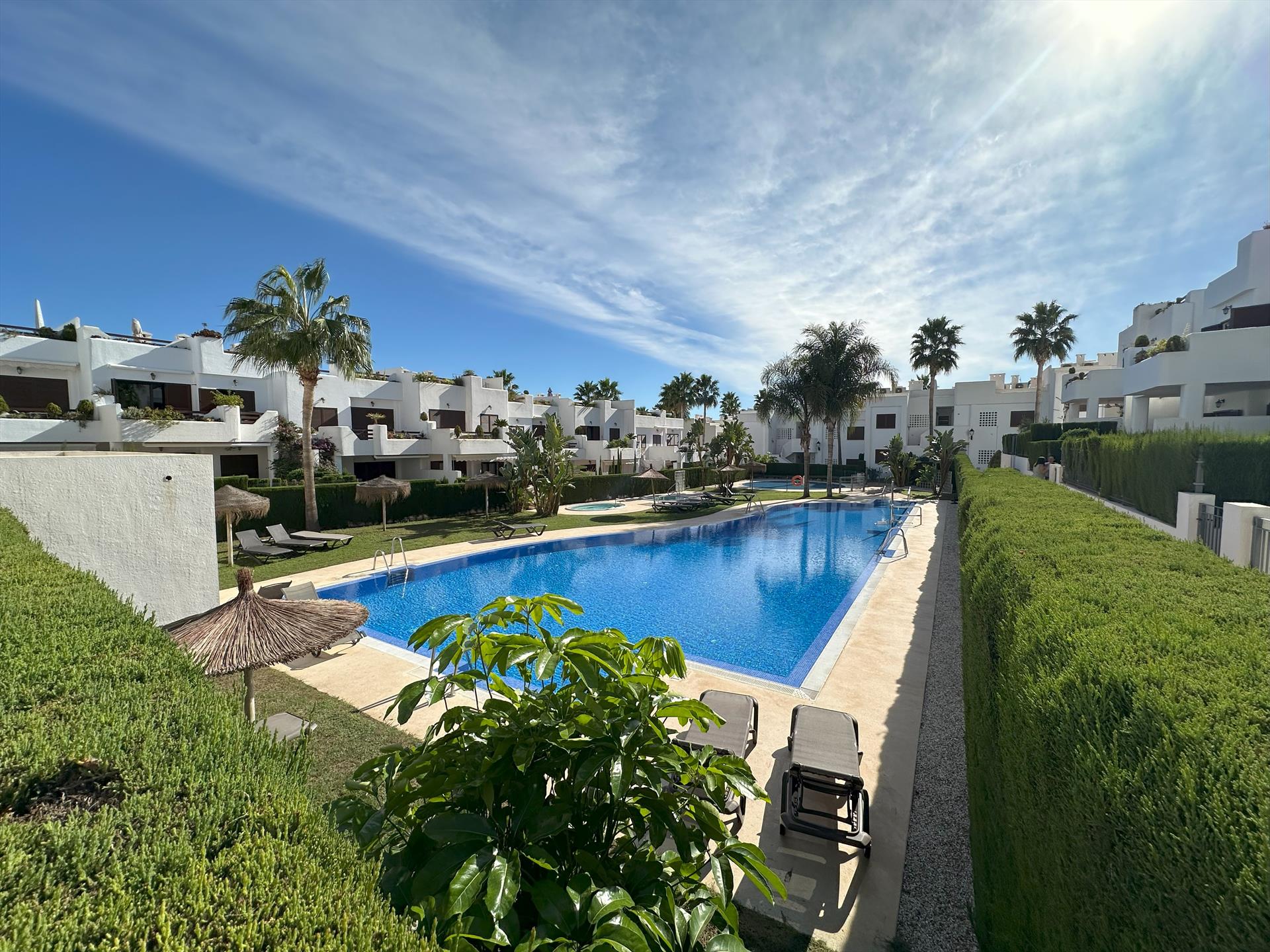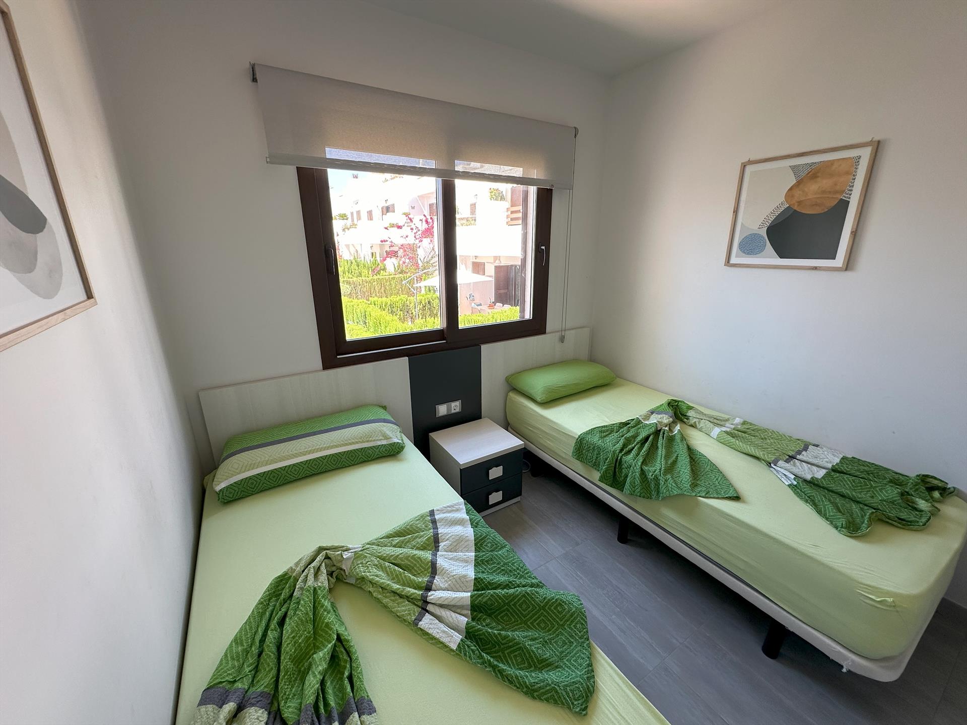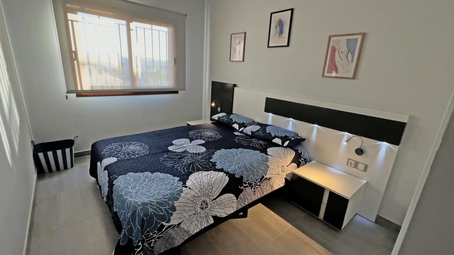 El apartamento cuenta con 2 dormitorios y 2 baños. El alojamiento ofrece un jardín con grava, un jardín comunitario con césped y árboles, y una vista a las montañas. Su comodidad y la cercanía a la playa, lugares para ir de compras, actividades deportivas, instalaciones de entretenimiento, lugares de interés y cultura, hacen de este un excelente apartamento para disfrutar de una larga estancia en España con familiares o amigos.