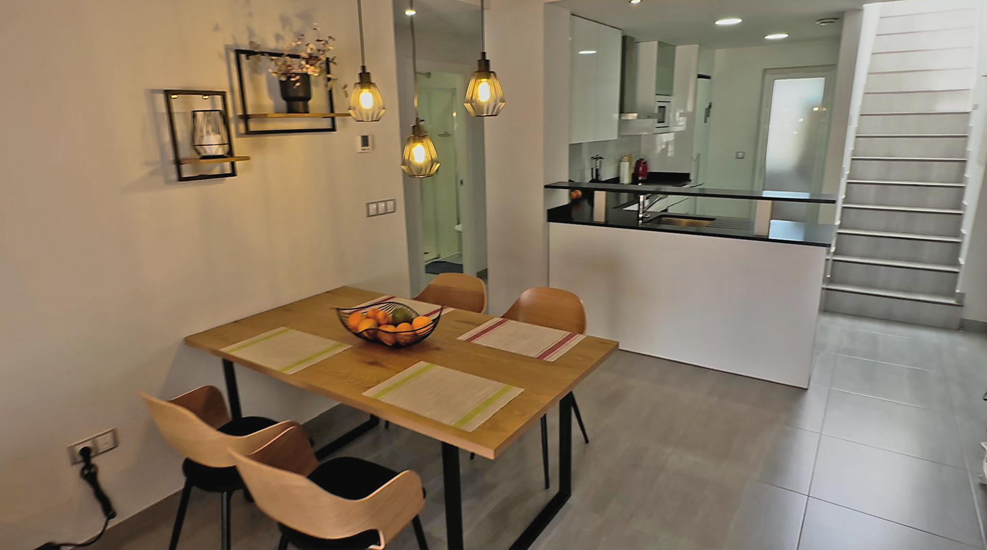 • cocina abierta con placa de inducción, horno eléctrico, microondas, lavavajillas, frigorífico-congelador, cafetera, hervidor eléctrico, tostadora y exprimidor
