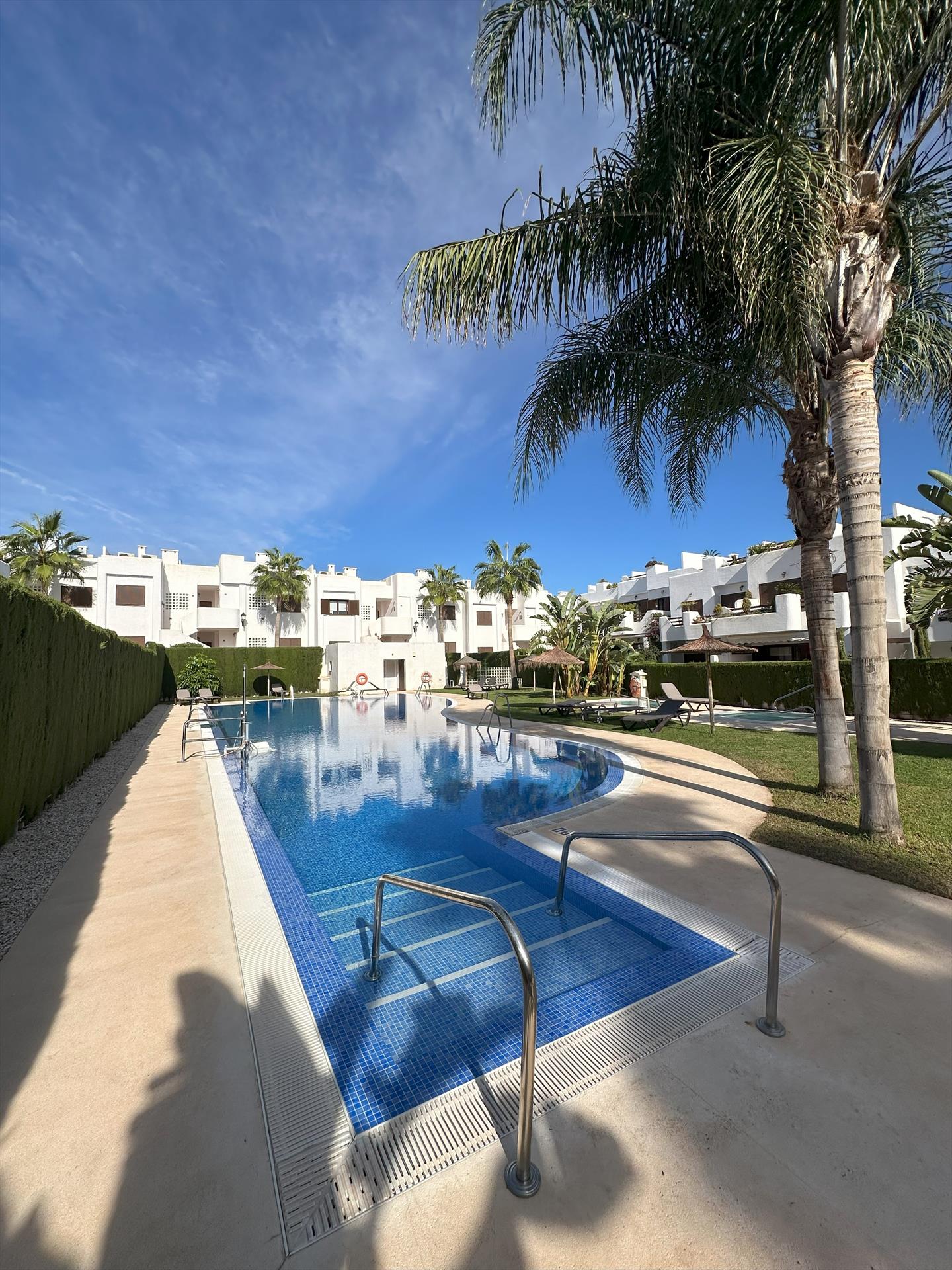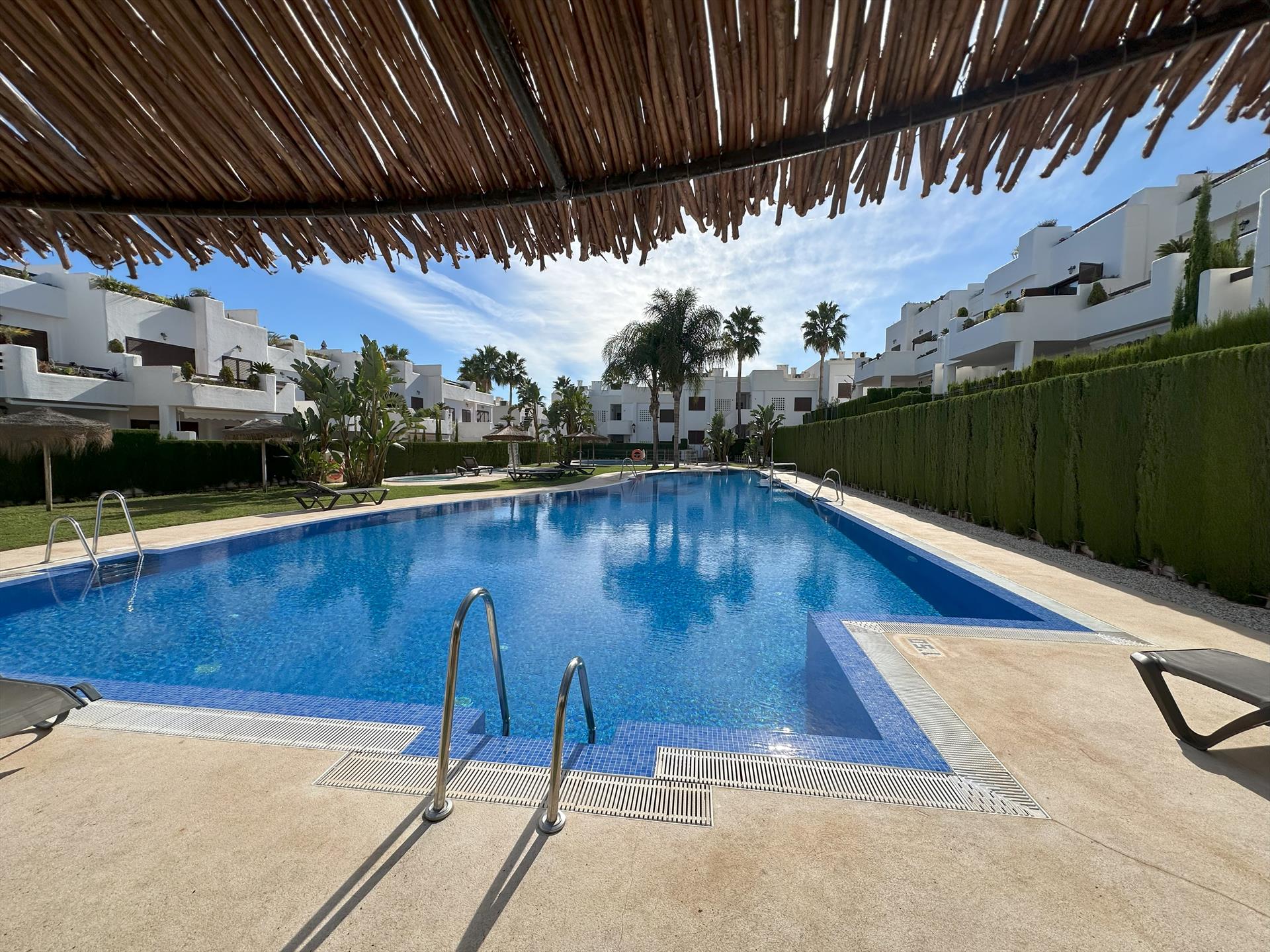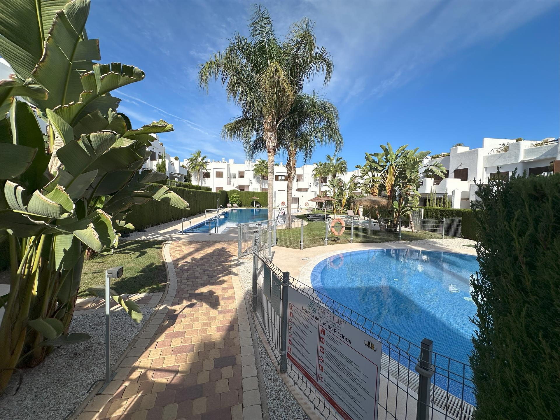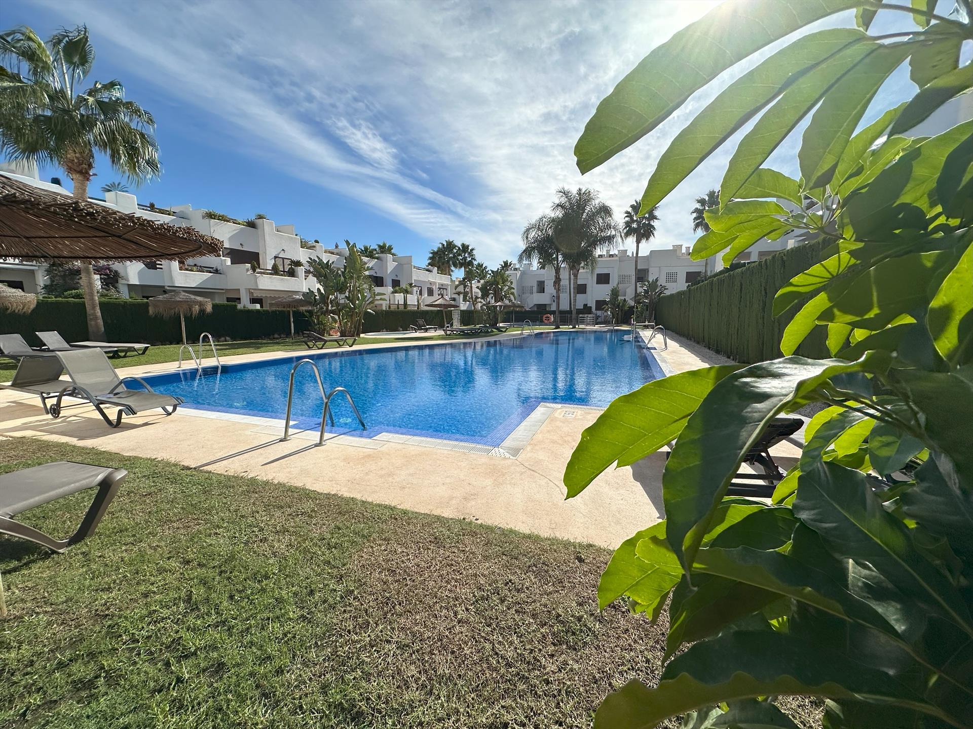 Encantador y alegre apartamento en San Juan de los Terreros, Andalucía, España, con piscina comunitaria para 4 personas. El apartamento está ubicado en un complejo de playa, en una zona residencial y montañosa, cerca de supermercados y a 200 m de la playa.