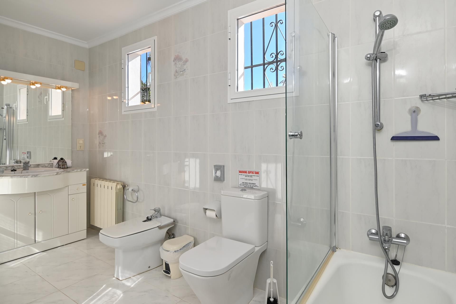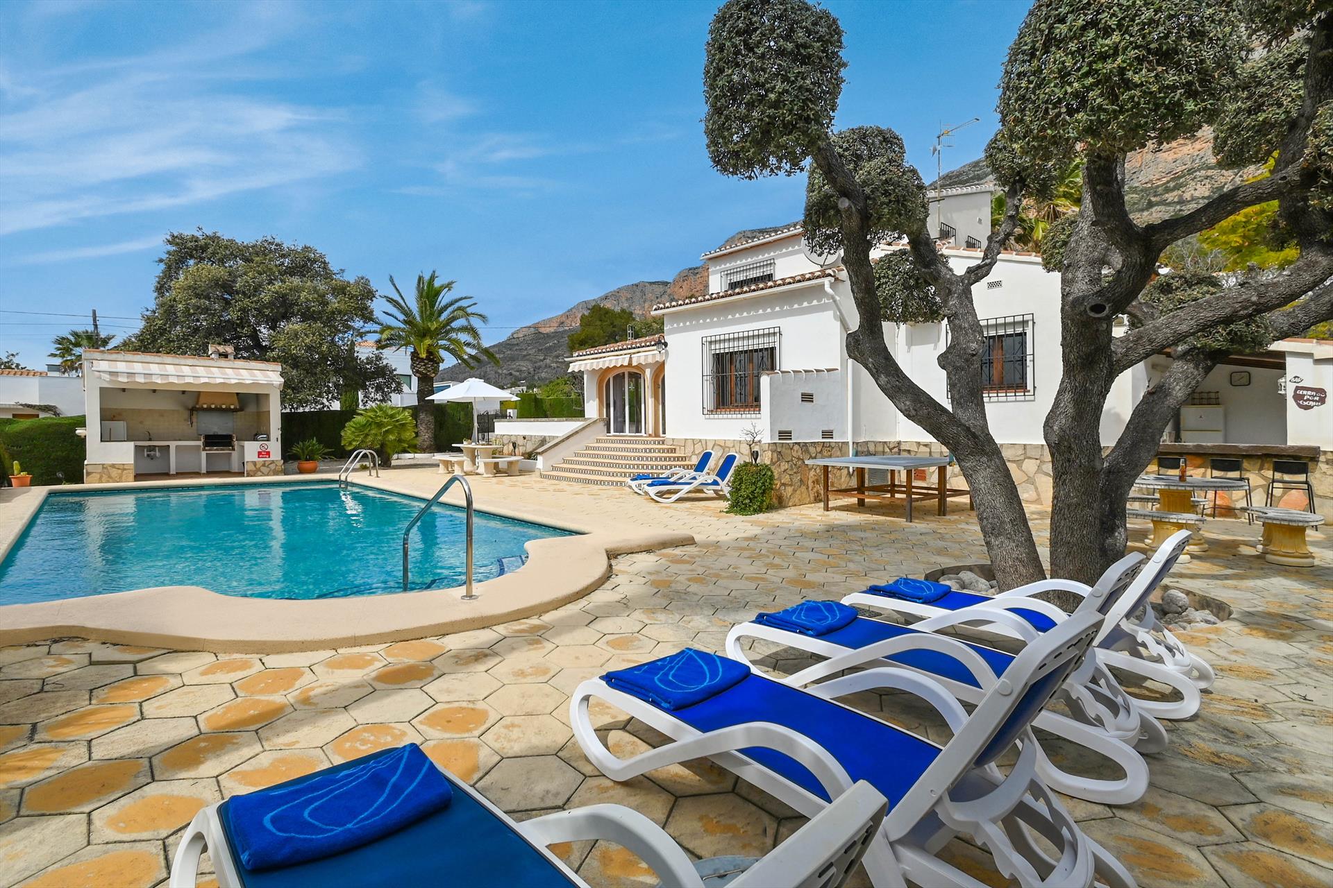 La casa de vacaciones cuenta con 5 dormitorios y 3 baños, distribuidos en 2 niveles. El alojamiento ofrece un jardín con grava y árboles, una hermosa piscina y vistas a las montañas. Su comodidad y la proximidad a la playa, lugares de compras, actividades deportivas, lugares para salir, atracciones y cultura hacen de esta casa de vacaciones un lugar ideal para disfrutar de sus vacaciones en España con familia o amigos.