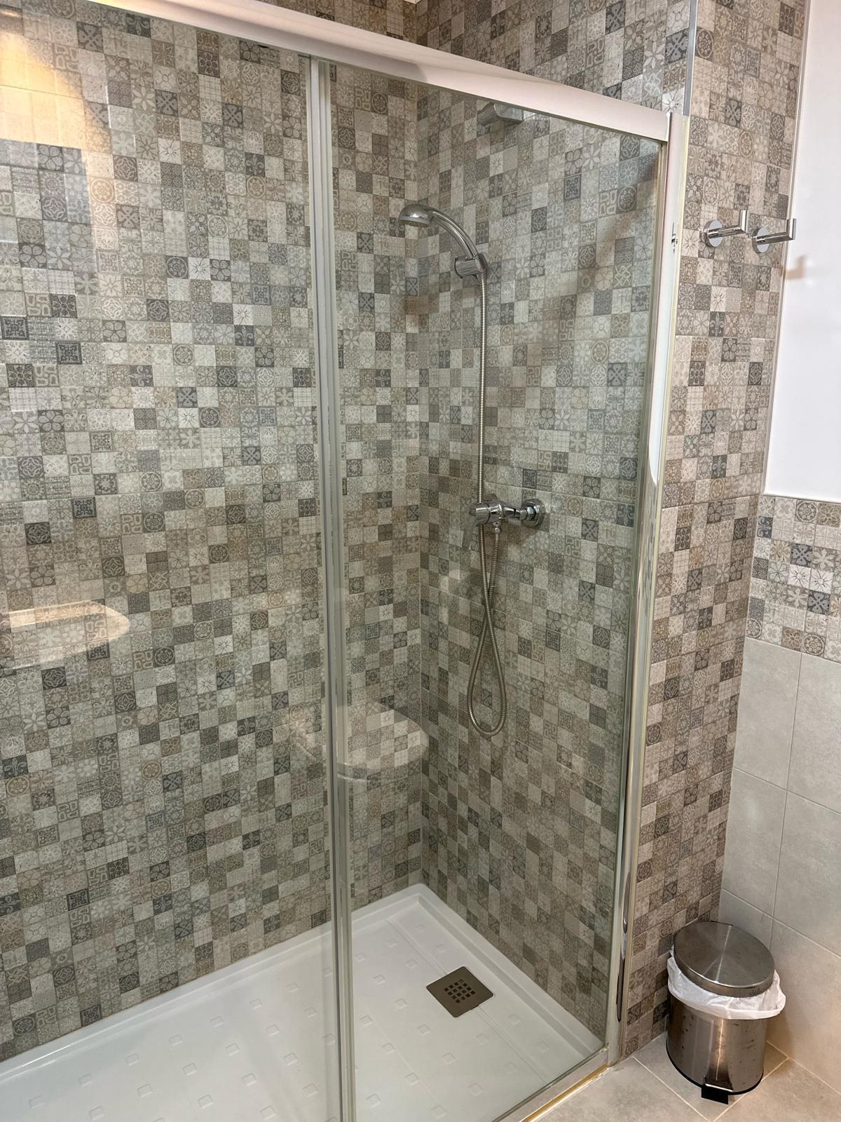 • Badezimmer mit Einzelwaschbecken, Dusche und Toilette