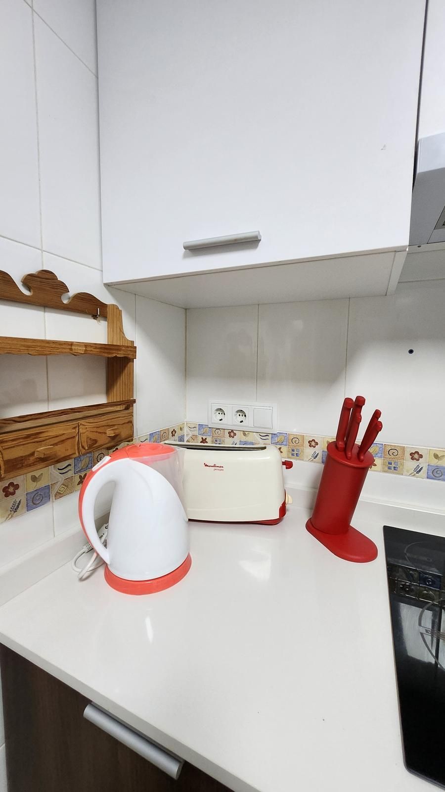 • Küche mit Elektroherd, Elektroofen, Mikrowelle, Geschirrspülmaschine, Kühl-Gefrierkombination, Kaffeemaschine, Wasserkocher, Toaster und Entsafter