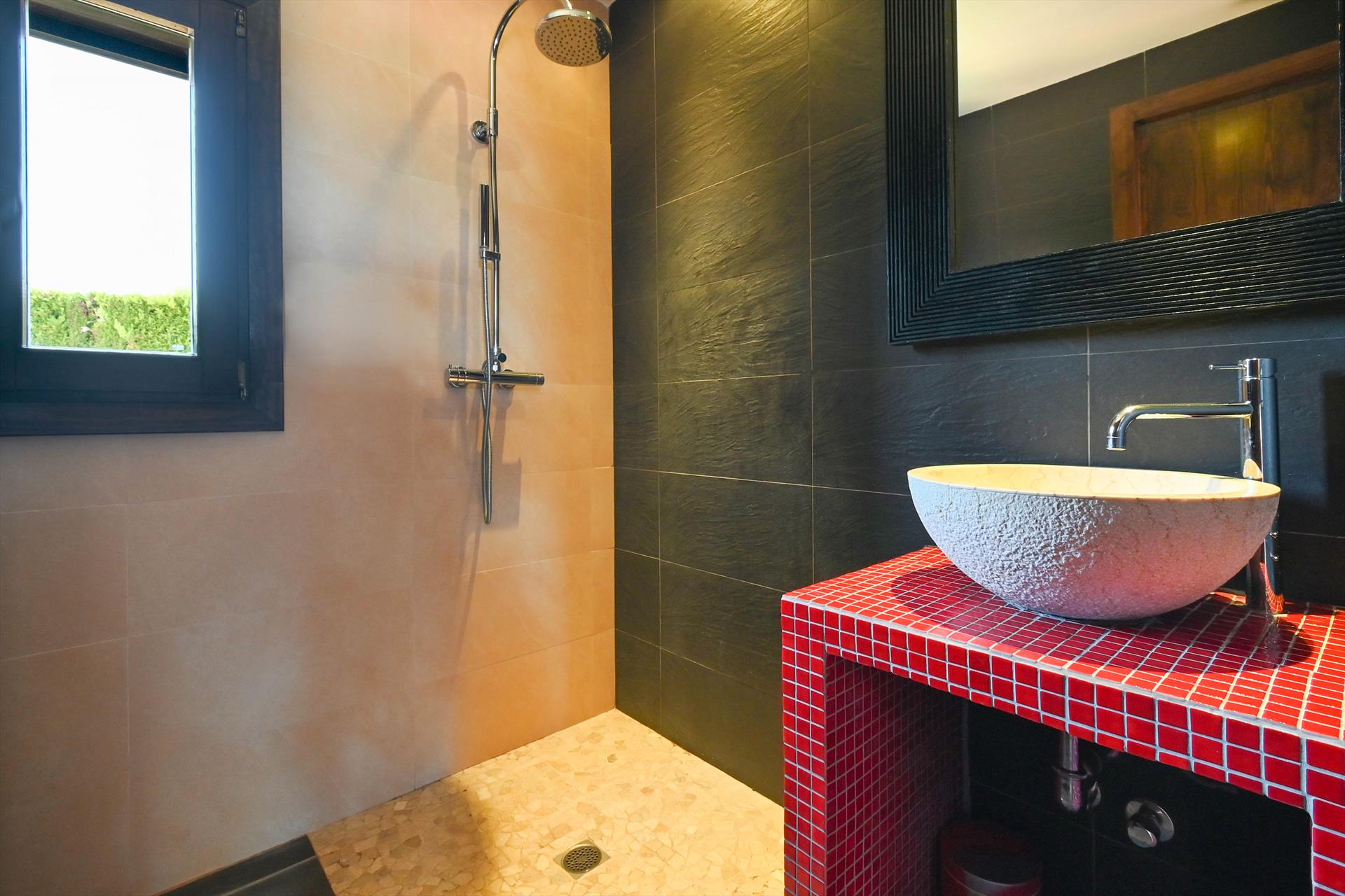 • Badezimmer mit Einzelwaschbecken und Dusche