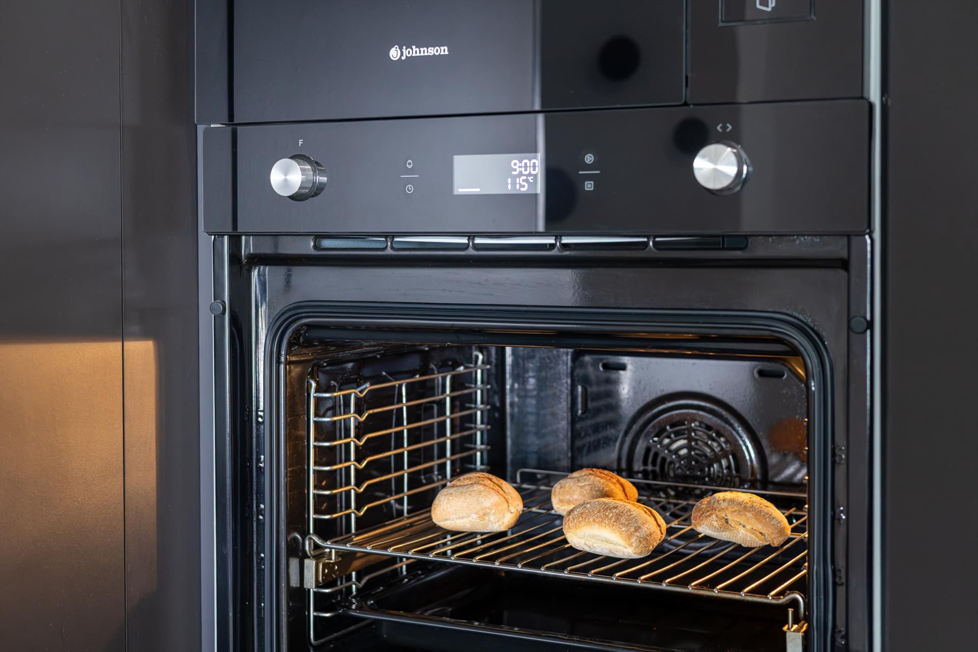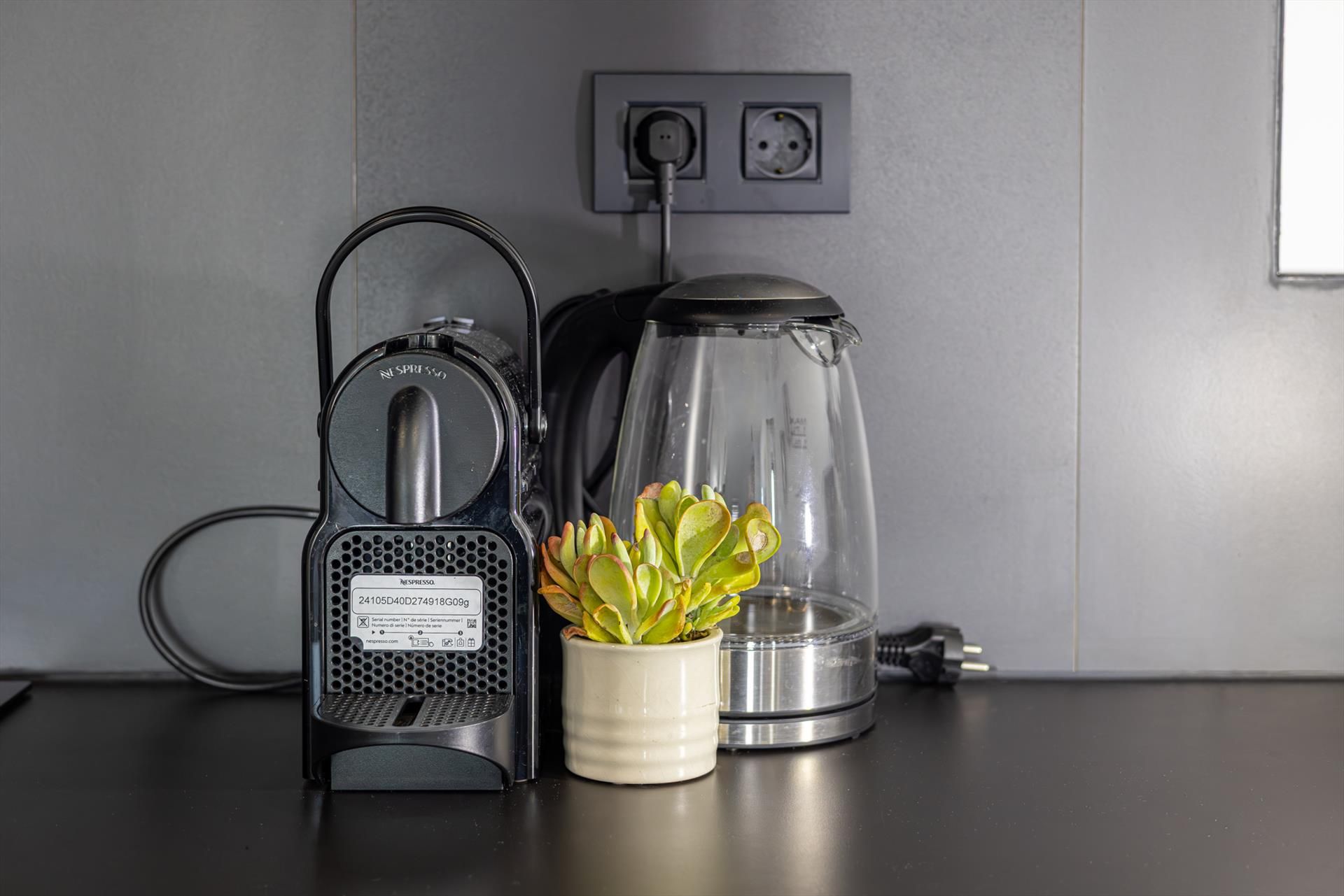 • open kitchen with electric hob, electric oven, microwave, dishwasher, refrigerator, freezer, coffee machine, electric kettle and toaster
