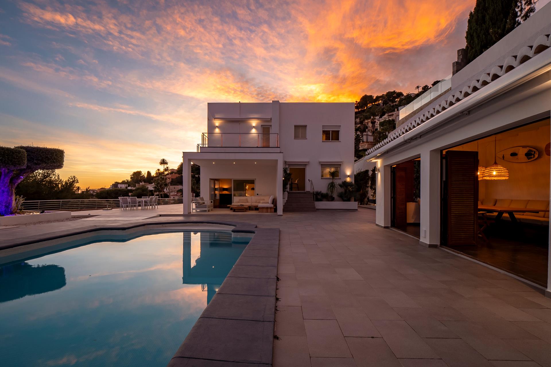 Villa moderne et confortable à Moraira, Costa Blanca, Espagne avec piscine chauffée pour 6 personnes. La maison est située dans un quartier résidentiel vallonné, à 4 km de la plage de L'Ampolla.