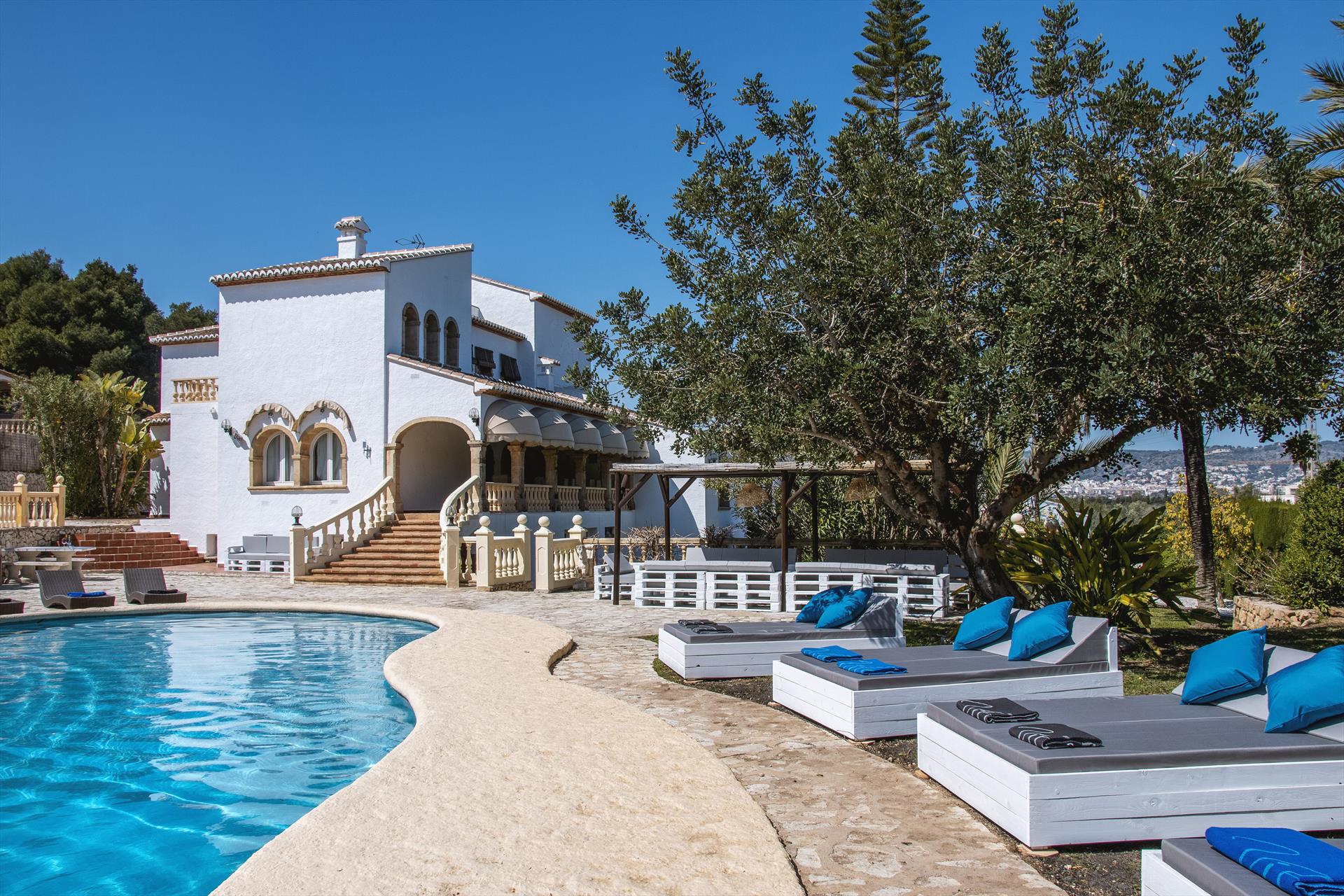 Grote en mooie villa met privézwembad in Jávea, Costa Blanca, Spanje voor 16 personen. De woning ligt in een residentiële strandwijk, dicht bij restaurants, bars en supermarkten, 1 km van El Arenal, Jávea strand en 1 km van Mediterraneo, Jávea.