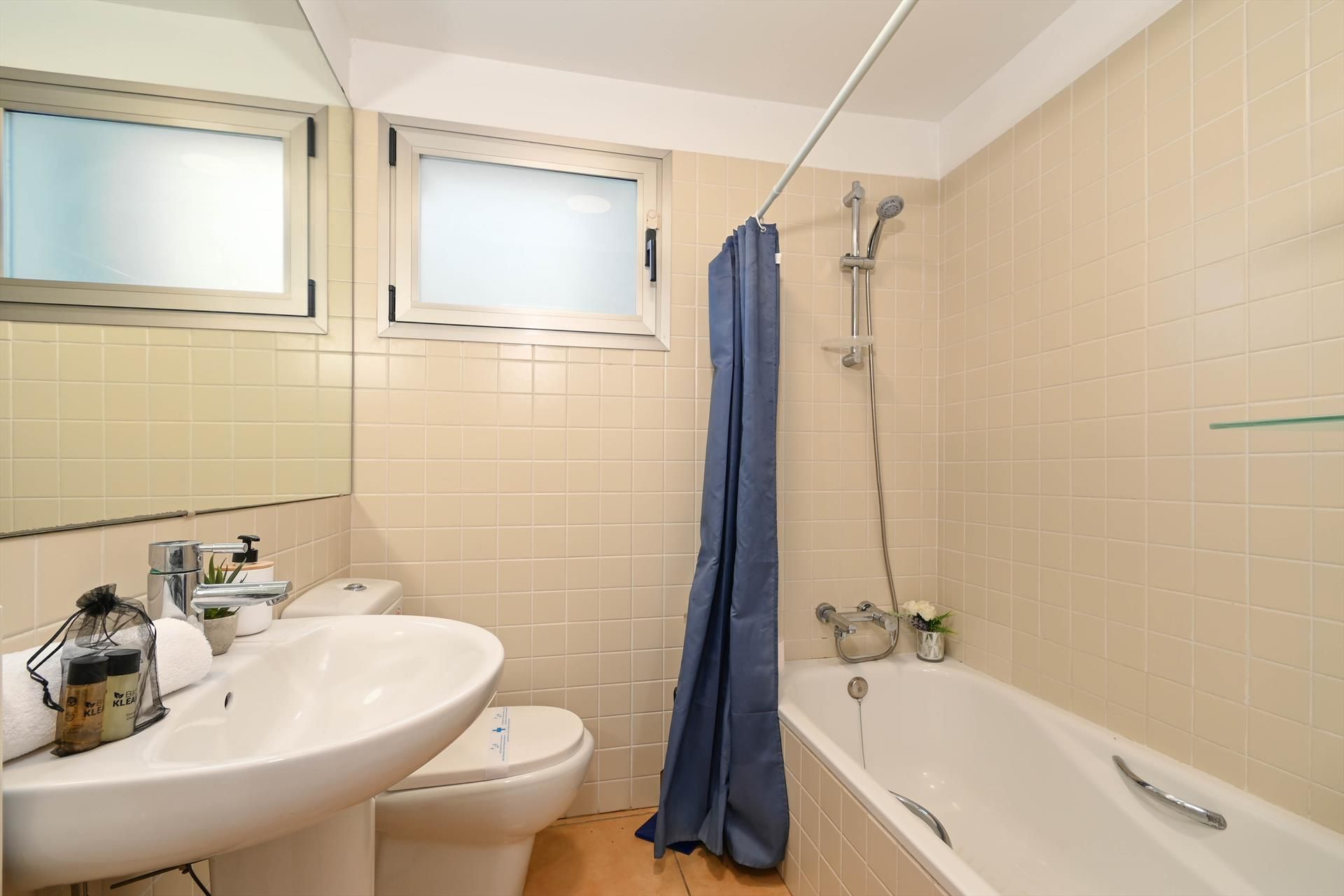 • badkamer met enkele wastafel, bad/douchecombinatie en toilet