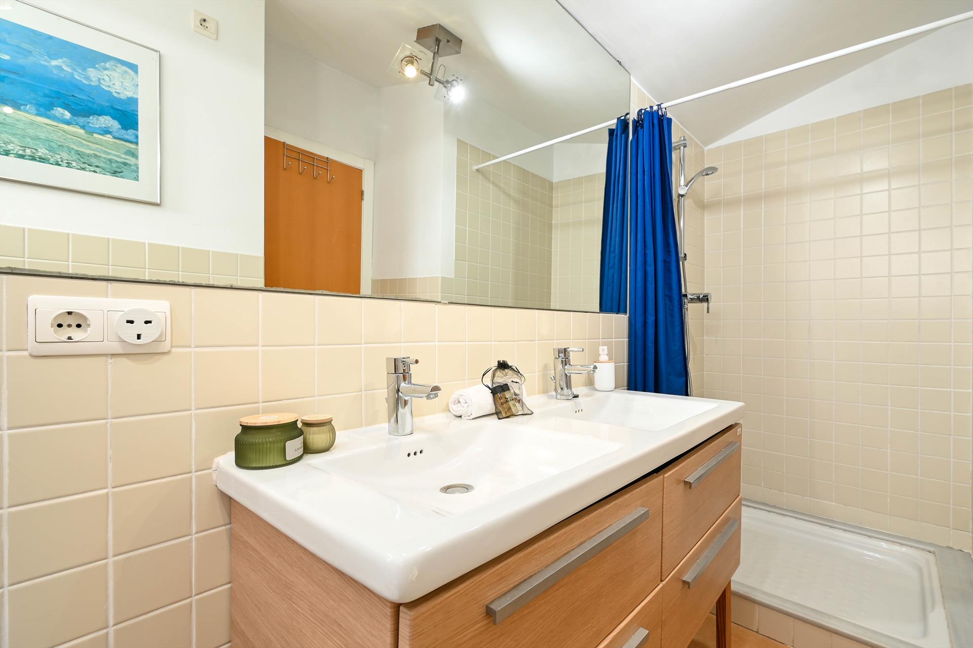 • badkamer met dubbele wastafel, douche en toilet