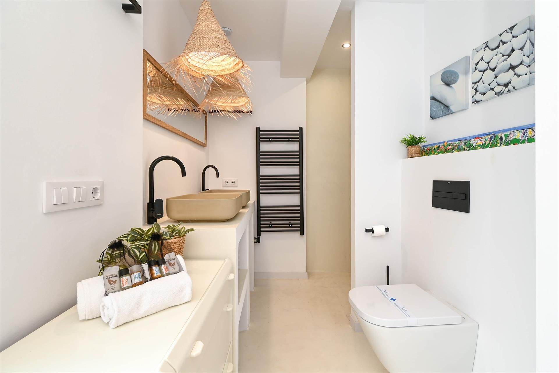 De villa beschikt over 3 slaapkamers en 3 badkamers, verdeeld over 2 niveaus. De accommodatie biedt privacy en een tuin met grind en bomen. Het comfort en de nabijheid van het strand, sportactiviteiten, bezienswaardigheden en cultuur maken dit een uitstekende villa om uw vakantie in Spanje met familie of vrienden door te brengen.